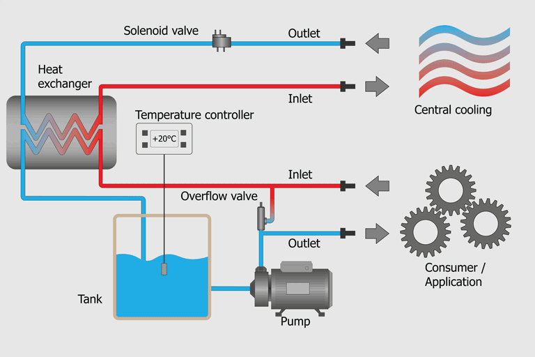 The waste heat generated by the chiller can be put to good use by feeding it back into another process, thus saving operating and energy costs. Via heat converters, the released waste heat of a low-temperature heating system can be fed directly or via heat pumps to any other heating circuit.